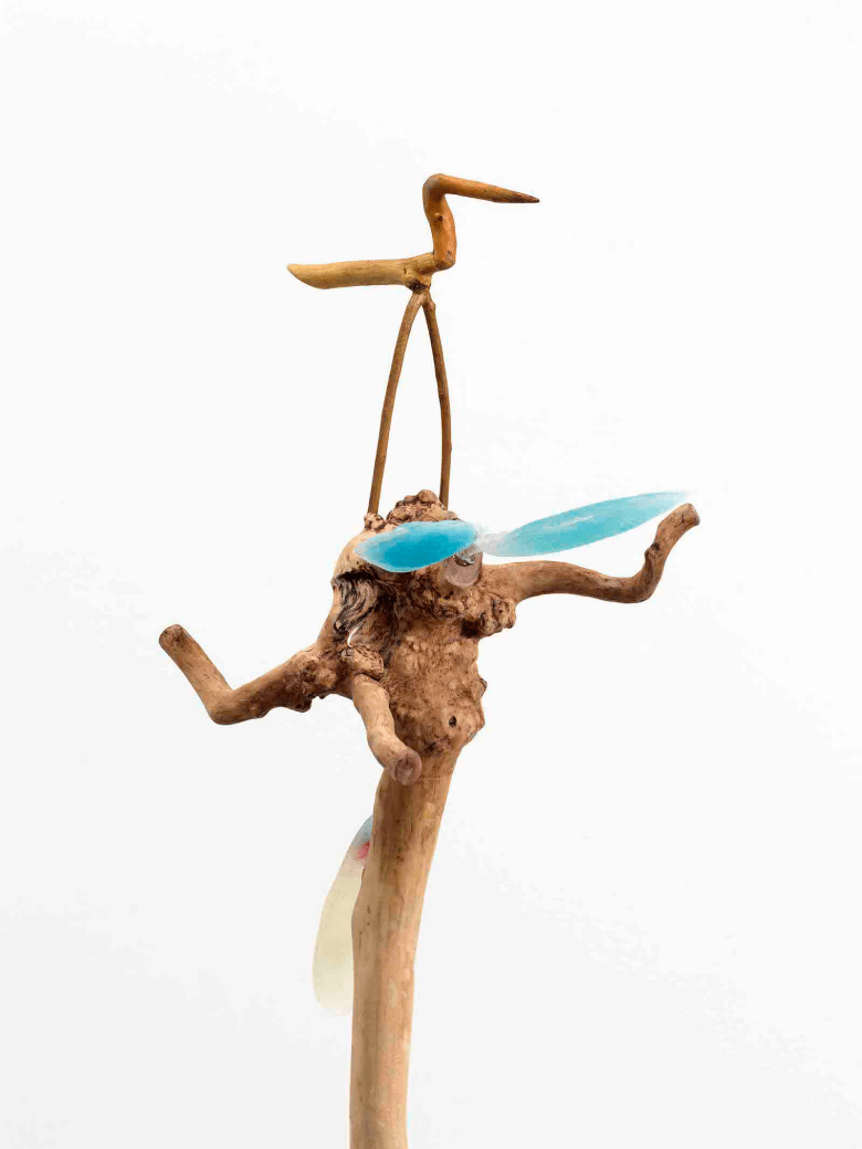 Lim, who was friends with Chai and his children, was given the canes that were broken or rotting, where they lay in her studio for a long time. Using cuttlefish bones and resin castings of them, hermit crab shells, glass balls, carved wooden birds (also made by Chai), polyurethane resin, metal plates, and artificial hair, Lim protects them from further decay, and creates the illusion that they are sprouting leaves. Leaf-like in shape, the cuttlefish bones introduce multiple readings into the work, including the joining of earth and ocean, domesticated parrots sharpening their beaks (for which they use the bones), and healing (they are believed to have medicinal properties).